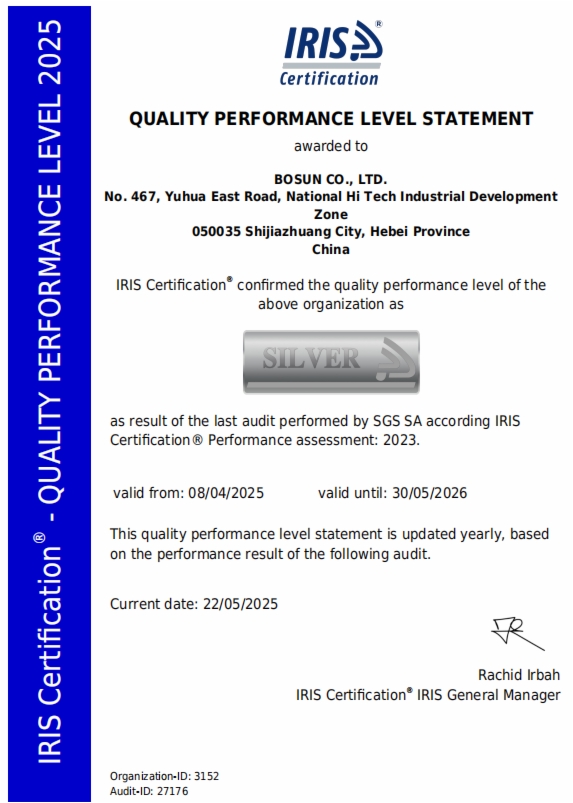 獲得IRIS銀牌認(rèn)證證書,是國際權(quán)威機構(gòu)對博深股份公司閘片質(zhì)量管理體系建設(shè)成效的充分肯定,也體現(xiàn)了博深股份公司對閘片產(chǎn)品質(zhì)量始終如一的高標(biāo)準(zhǔn)追求,將大大提升博深股份公司在國內(nèi)外軌道交通行業(yè)的影響力和競爭力,助力山東鐵投集團加快推進“353”產(chǎn)業(yè)發(fā)展戰(zhàn)略尤其是高端裝備制造業(yè)高質(zhì)量發(fā)展。